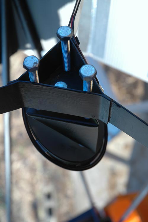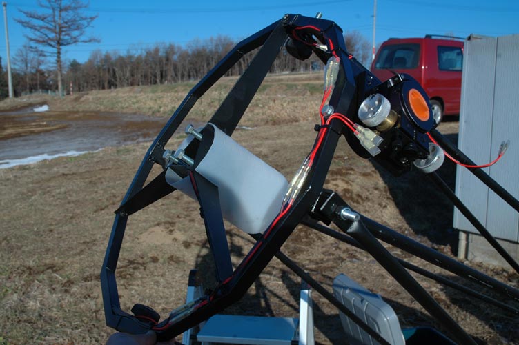 トラス式のドブソニアンなので、トラス棒の先につける部分がひとまとまりの望遠鏡の構成要素になります。 この部分をトップリングと読んでいます。通常はトップリングの回りに「カバー」を付けて使用します。 赤色の配線はヒーターの配線となります。