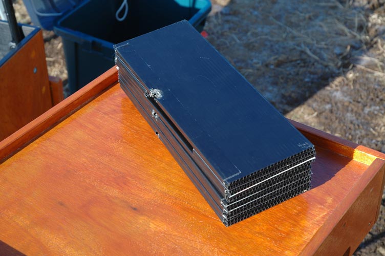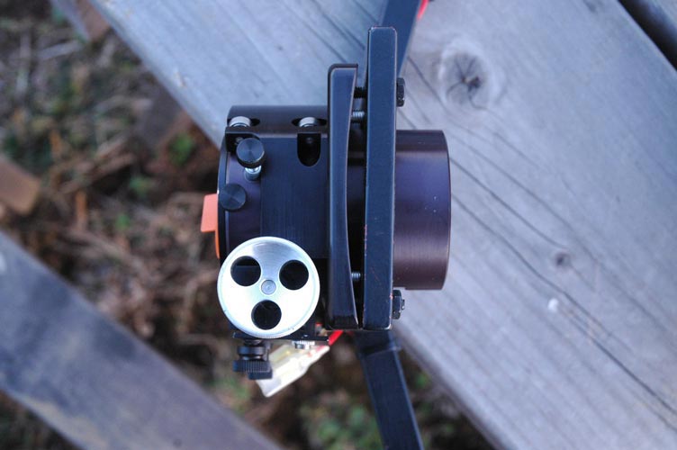 100mm x 100mm x 10mm のアルミ板で作りました。直径70mmの穴は小さな穴をたくさん開けて、糸鋸・金工ヤスリでそれらをつなげ、 開けました。接眼部には傾き調整用のネジがあるので、それをまわして傾きを調整しています。