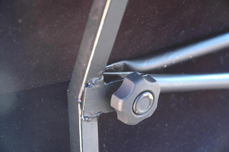 トップリング側は長さ80mm程のずんぎりネジでトラス棒2本をつなげた構造をしています。 そこにノブスターにナットを入れた物を使ってトップリング側の金具を 落とし込み、固定します。