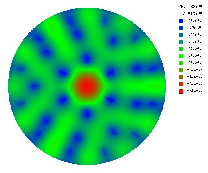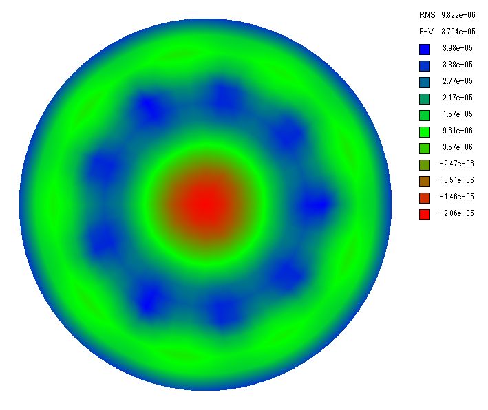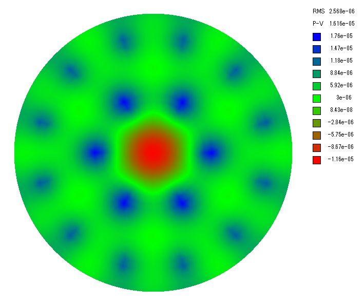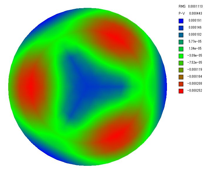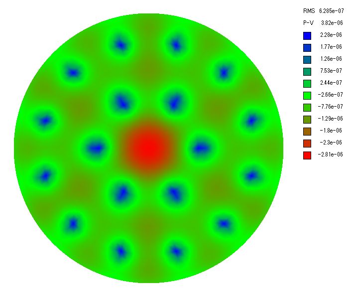 ここで波長505nm(暗順応視感度のピーク)の場合の波面誤差を計算します。 波面誤差は鏡面誤差の2倍なので支持点が3点、6点、9点、18点、27点、54点の場合、PVの波面誤差は約1.8λ、λ/4.2、λ/6.7、λ/16、λ/30、λ/60と計算されました。