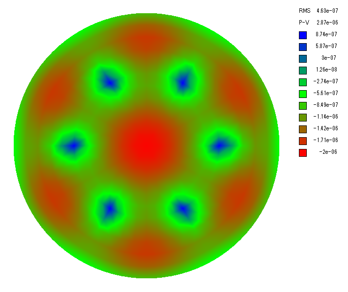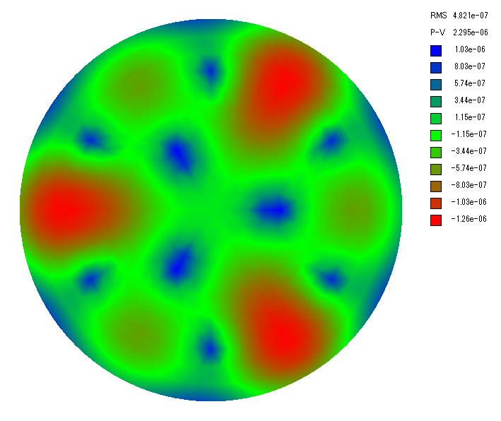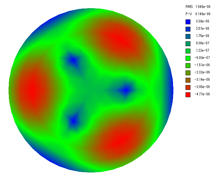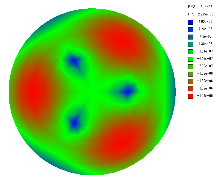 ここで波長 505 nm(暗順応視感度のピーク)の場合の波面誤差を計算します。 波面誤差は鏡面誤差の 2 倍なので支持点が 3 点、6 点、9 点の場合、PV の波面誤差は λ/31~λ/86、λ/88~λ/200、λ/110~λ/290 となりました。