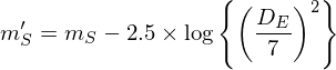 よってこれらの式から識別可能な天体の単位面積あたりの等級は、以下の式で表されることになります。