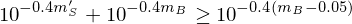 そもそも星が見える・見えないとは に書いたように、天体が見えるとは背景に対して天体が有意なコントラストを持っていることを意味します。 肉眼の限界等級 (淡く広がった天体の場合) の実験1で示したように、私の目では 0.1 [等級/平方秒] の違いを明るさの違いとして識別することが出来ました。 さらに経験上はもう少しs小さな輝度差でも区別は可能だと思います。 よってここでは 0.05 [等級/平方秒] の違いを明るさの違いとして識別可能だと考えます。 0.05 [等級/平方秒] の明るさの違いとは約 5 [%] の明るさの違いに相当します。 これは「天体+バックグラウンドの明るさ」が「バックグラウンドの明るさ」に対して約 5 [%] 明るければ天体を検知出来ると言うことを意味します。 これを式で表すと以下のように書けます。