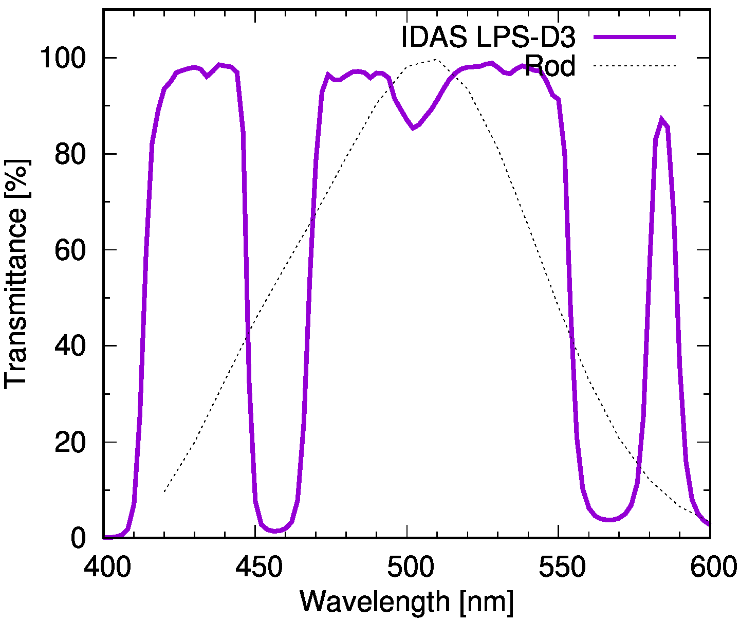 IDAS LPS-D3フィルターは光害カットタイプのフィルターで、大気光、白色LED、ナトリウムランプの光害をカットするような透過率特性を有しているそうです。 美星天文台天体スケッチ で使用することを想定して購入してみた。 美星天文台のある岡山県井原市は光害があって少々空が明るく、そこで少しでもコントラストを上げて気持ちよく観望できればと考えている。