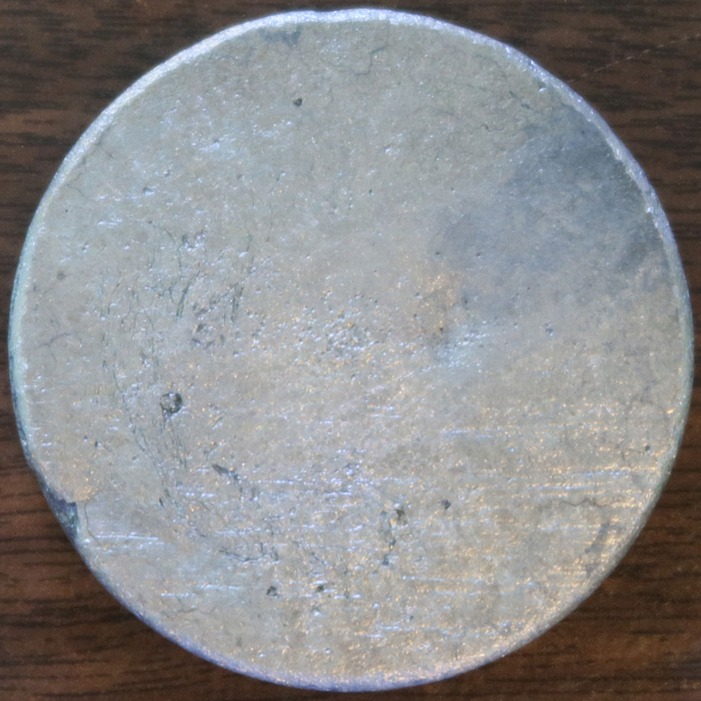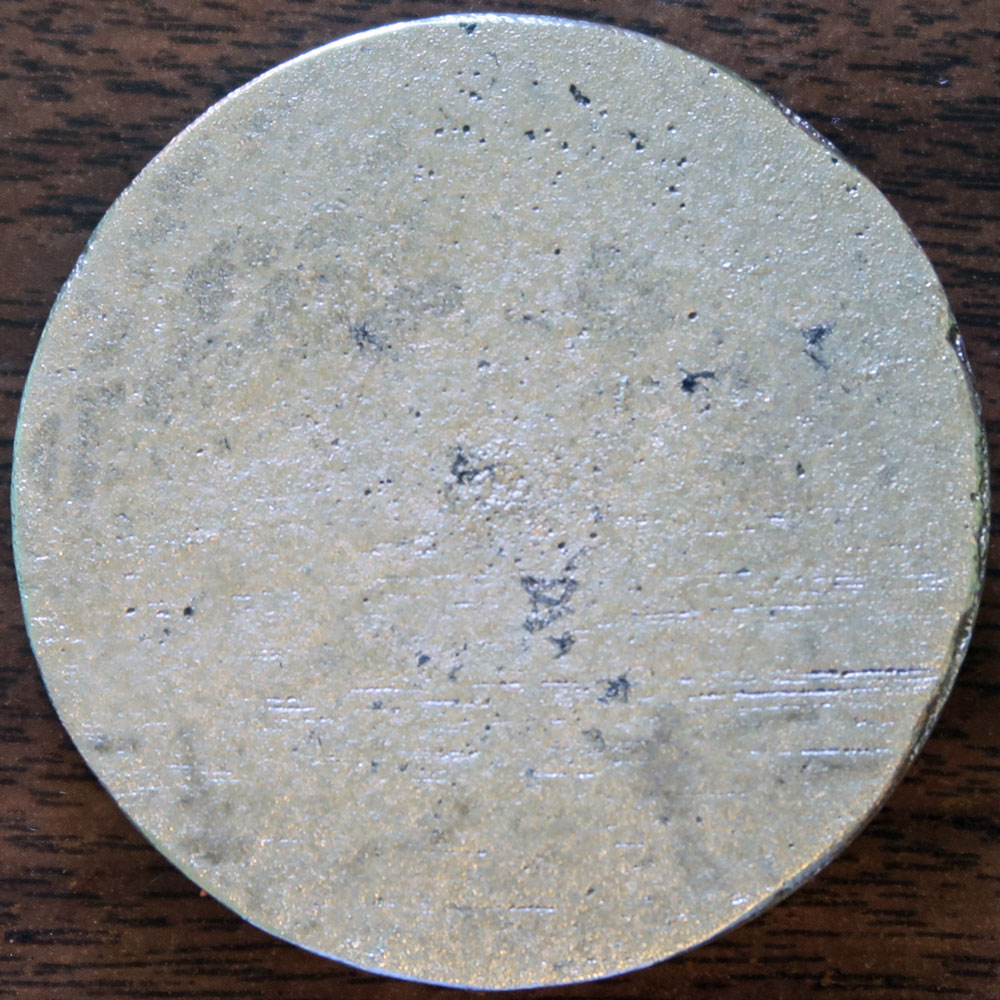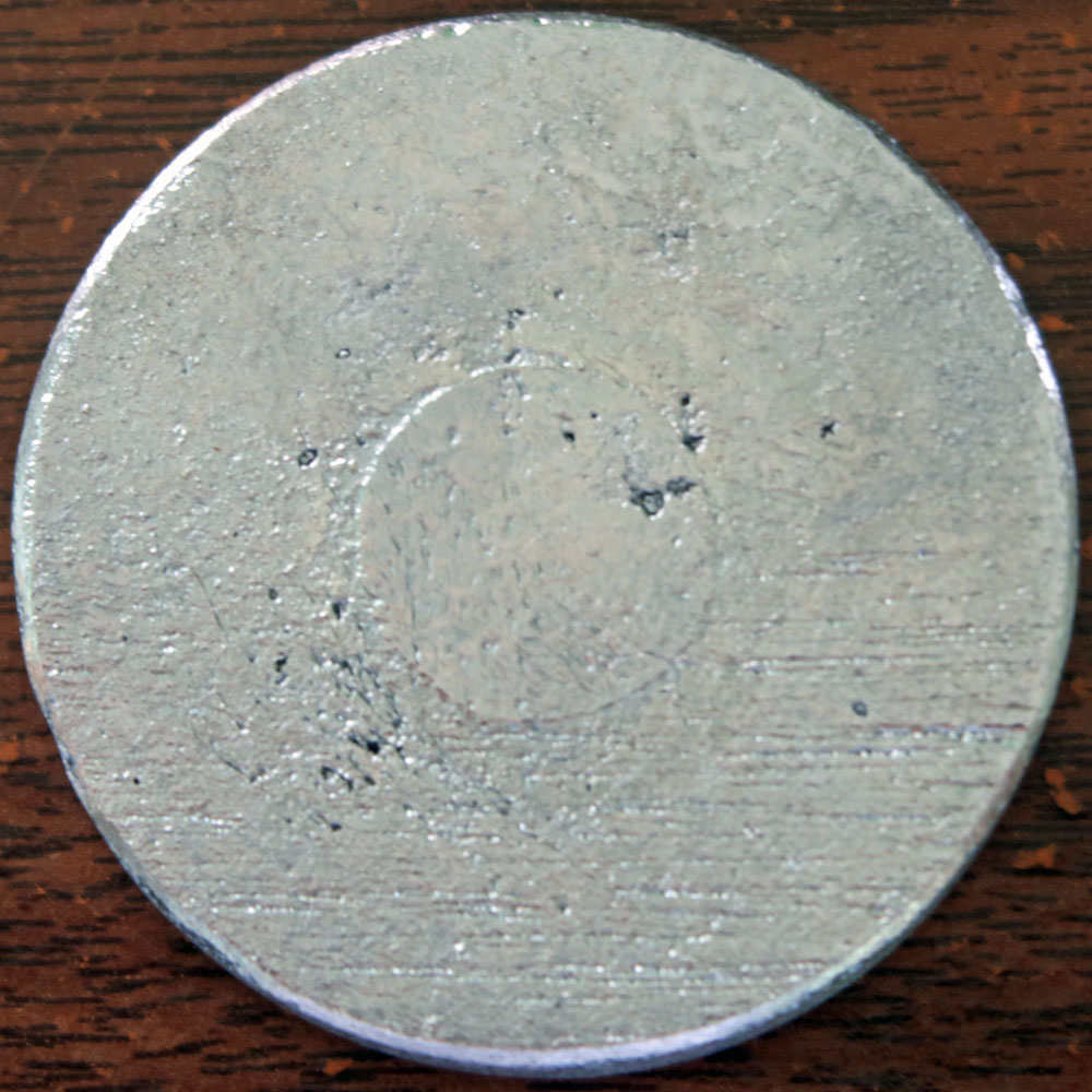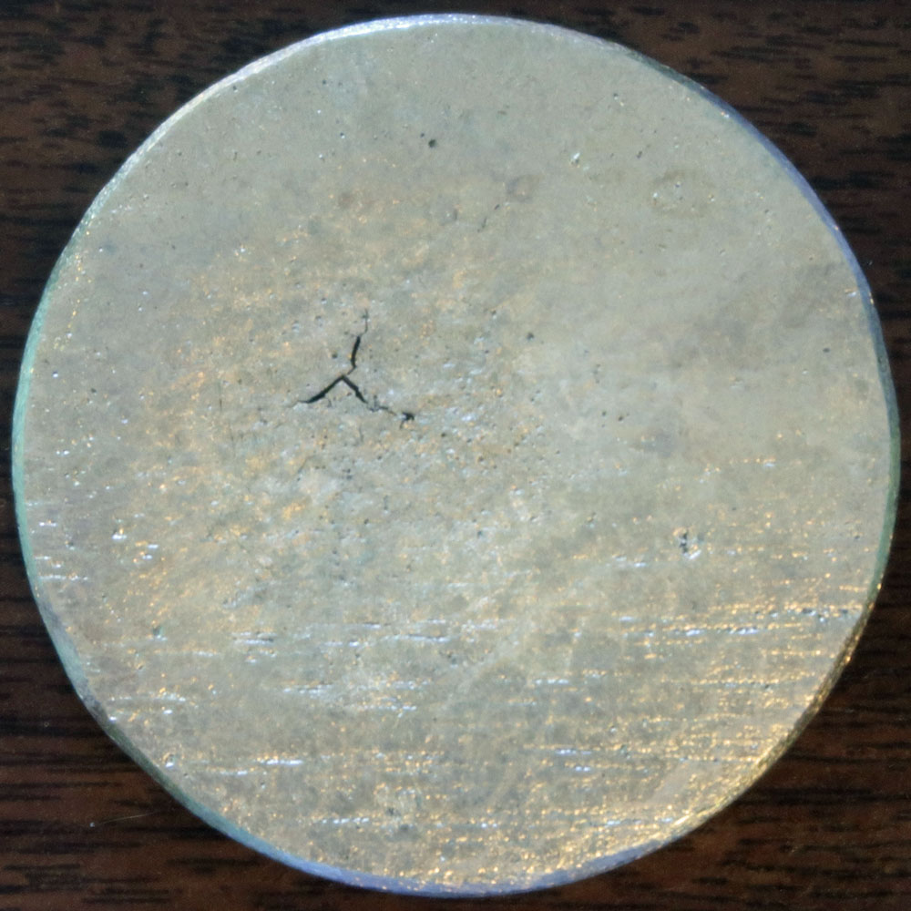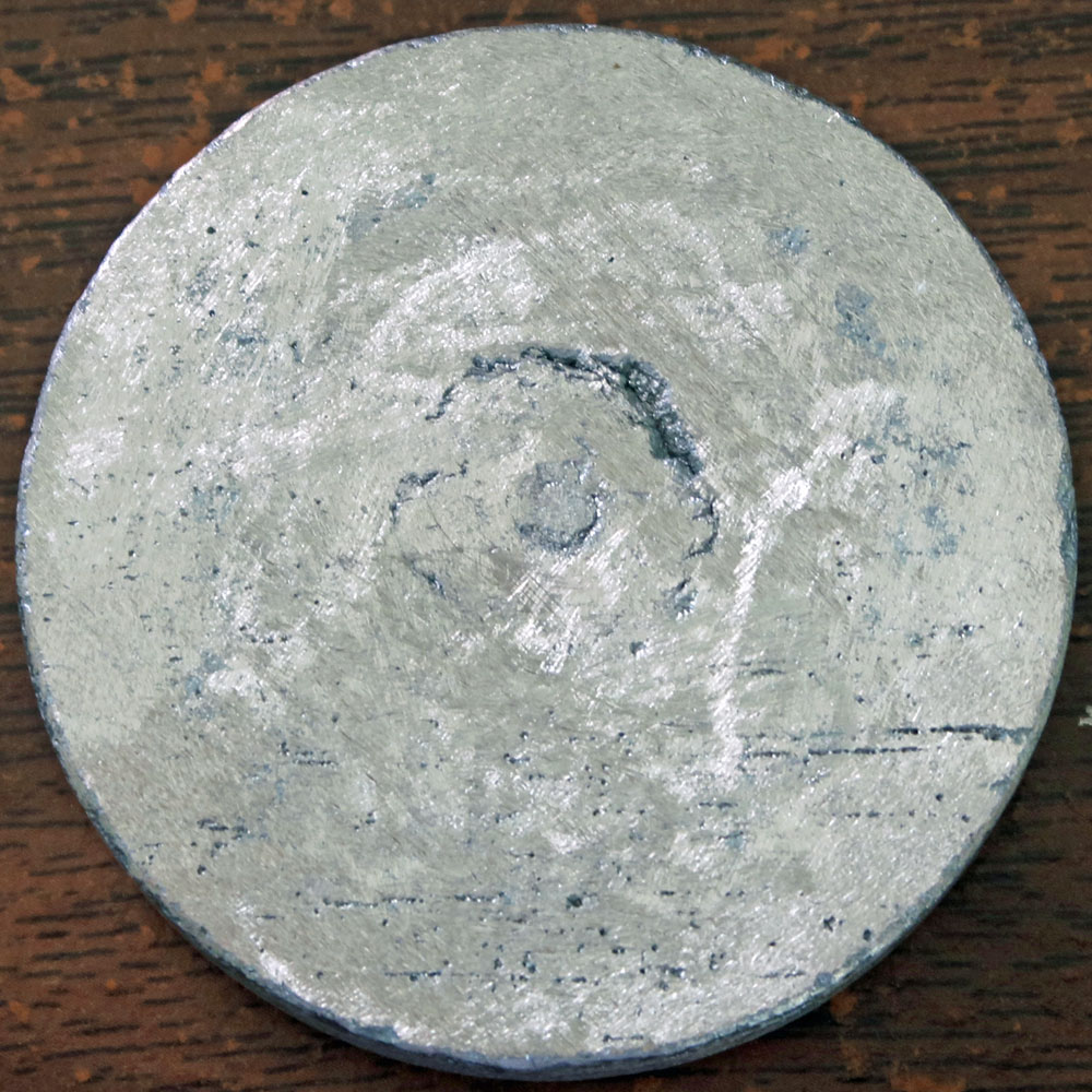錫 35.1%、銅 64.9% #48 国友一貫斎の金属鏡 揚がり湯面が10mm程度陥没して穴 硬くて脆いが加工性は悪くない、0.3mmぐらいの赤い錆びのような模様、金属 |