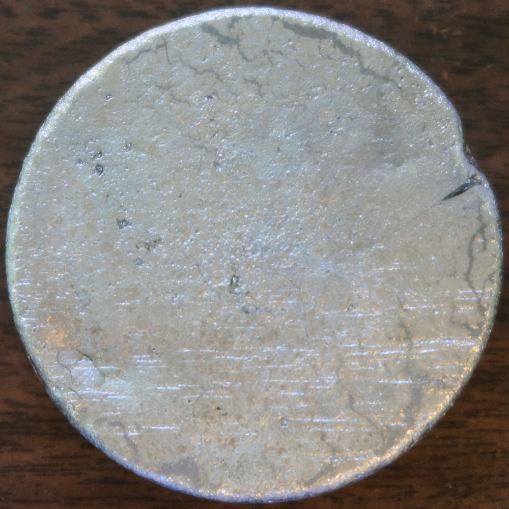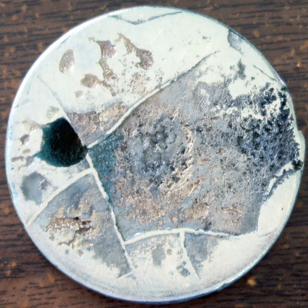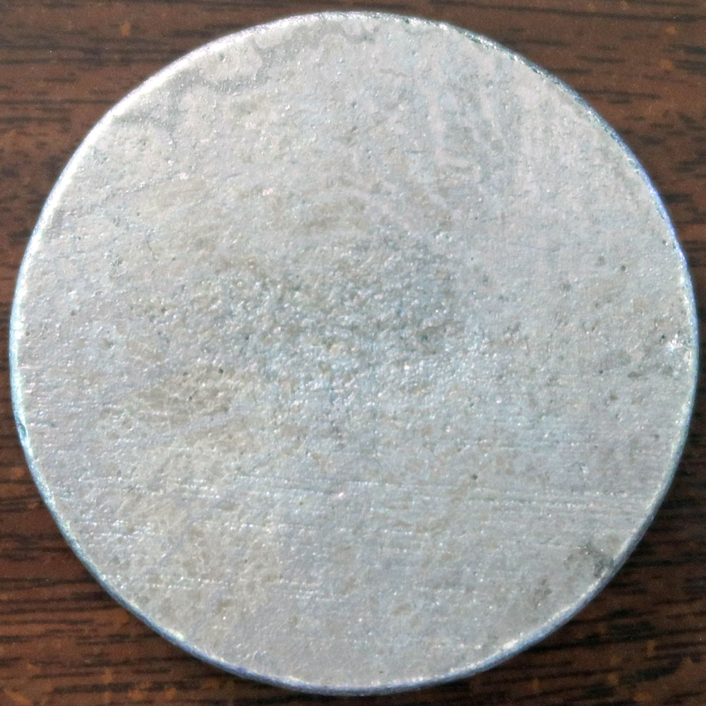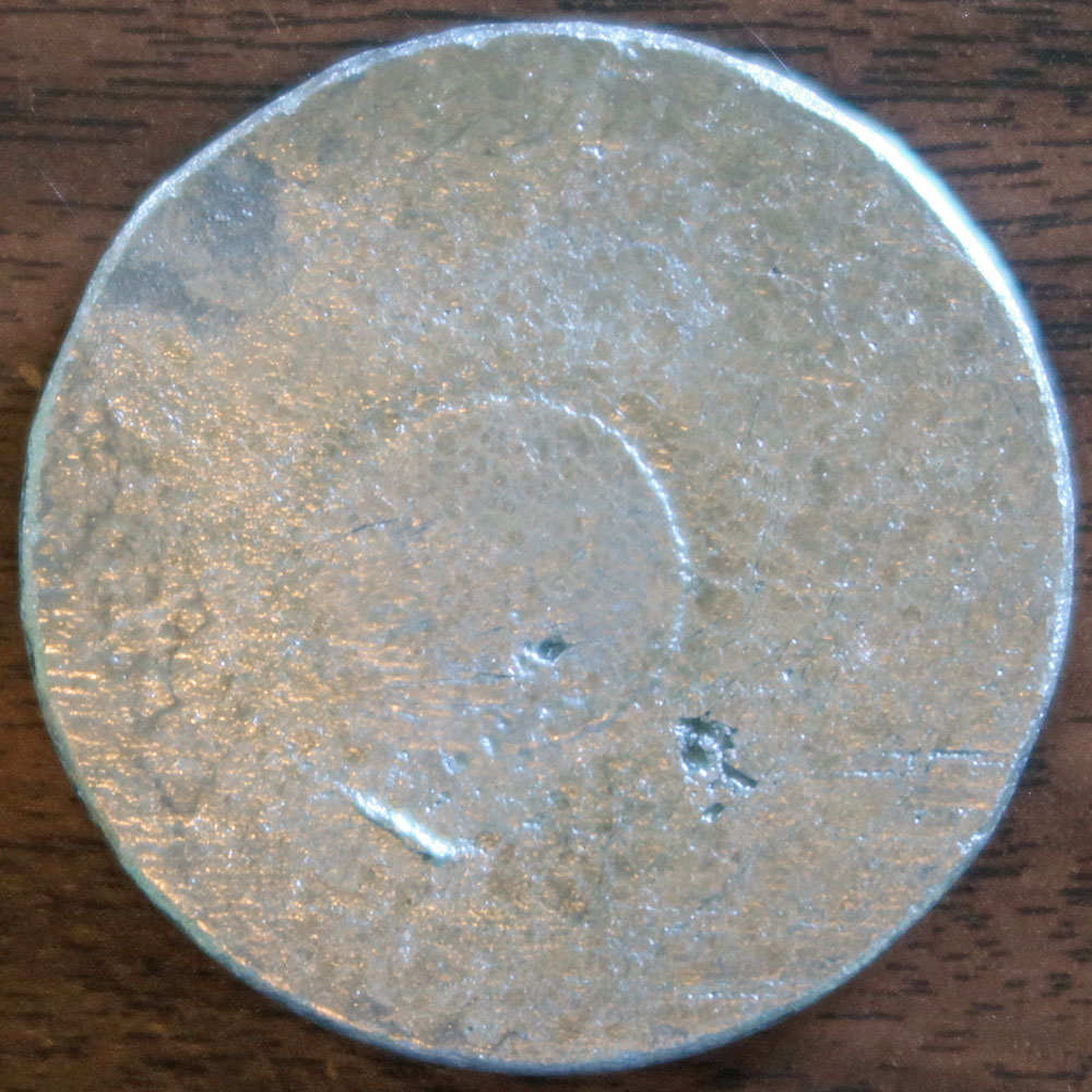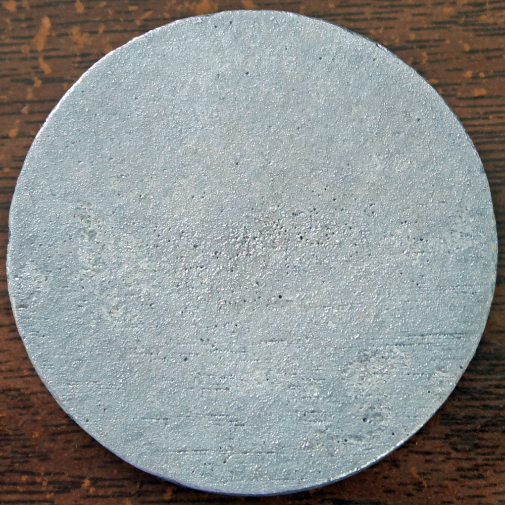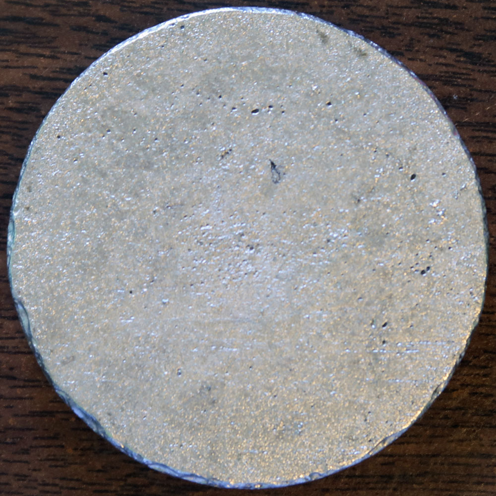 錫 35.1%、銅 64.9% #48 国友一貫斎の金属鏡 揚がり湯面が10mm程度陥没して穴 硬くて脆いが加工性は悪くない、0.3mmぐらいの赤い錆びのような模様、金属 |