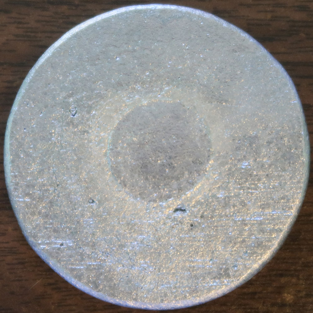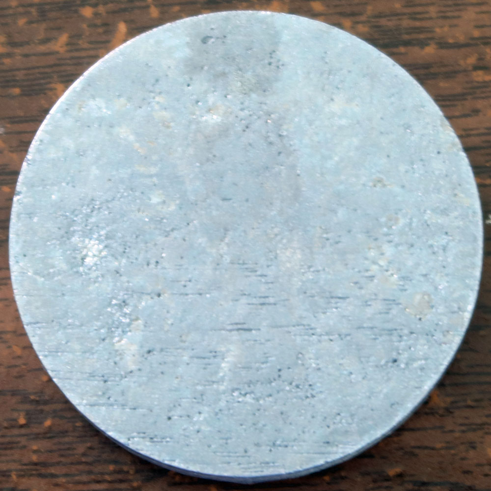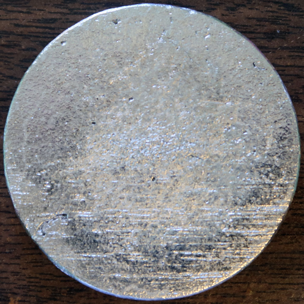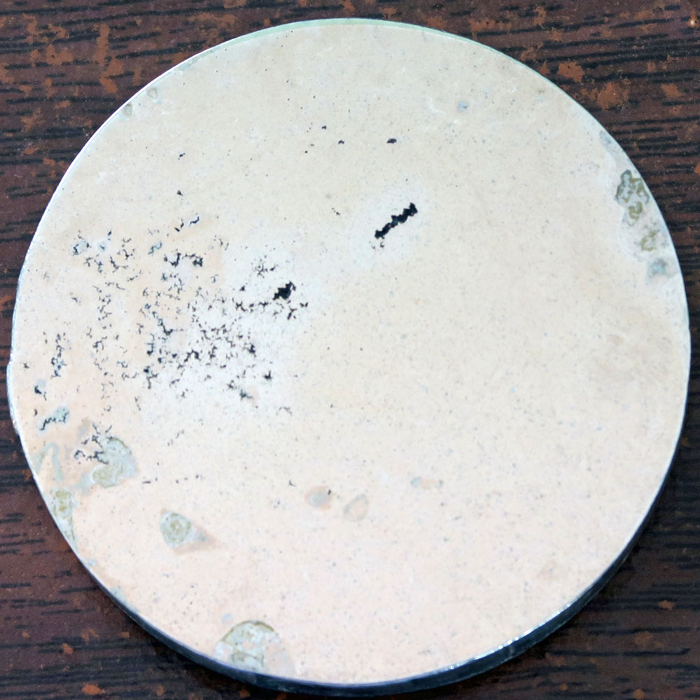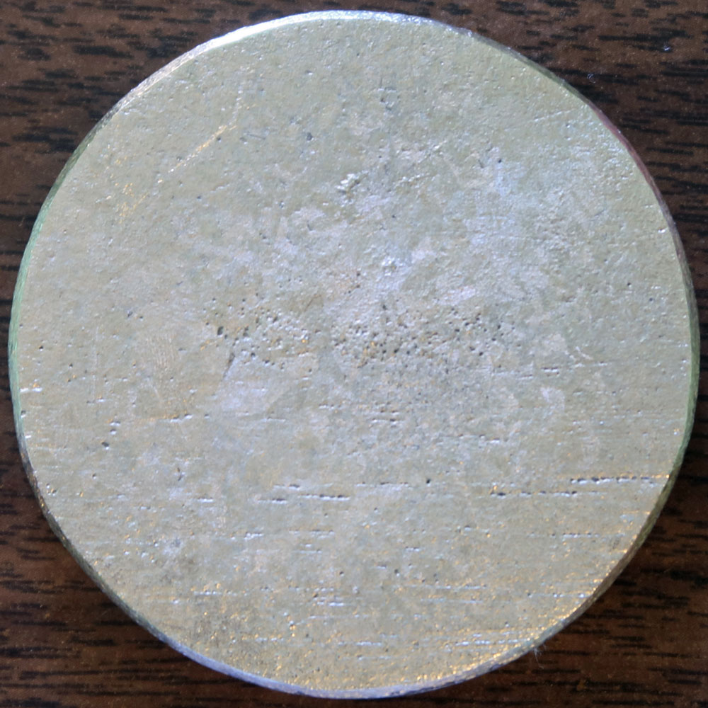 錫 35.1%、銅 64.9% #48 国友一貫斎の金属鏡 揚がり湯面が10mm程度陥没して穴 硬くて脆いが加工性は悪くない、0.3mmぐらいの赤い錆びのような模様、金属 |
