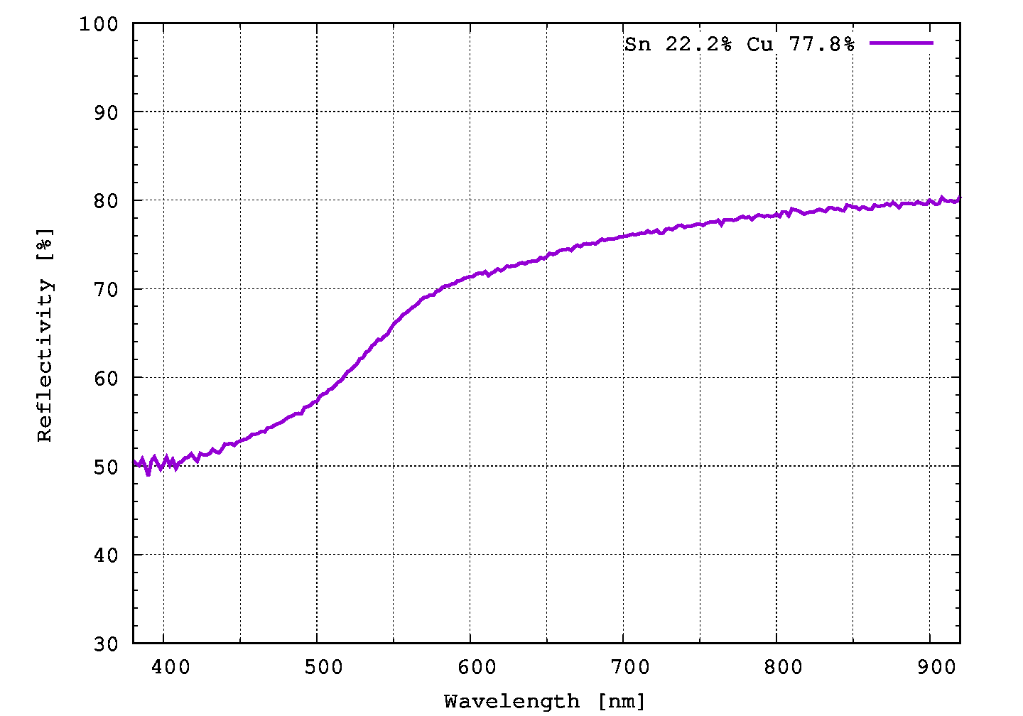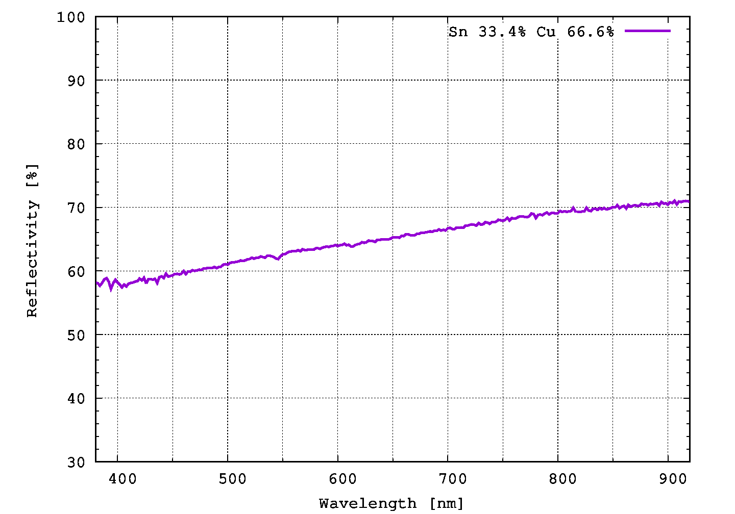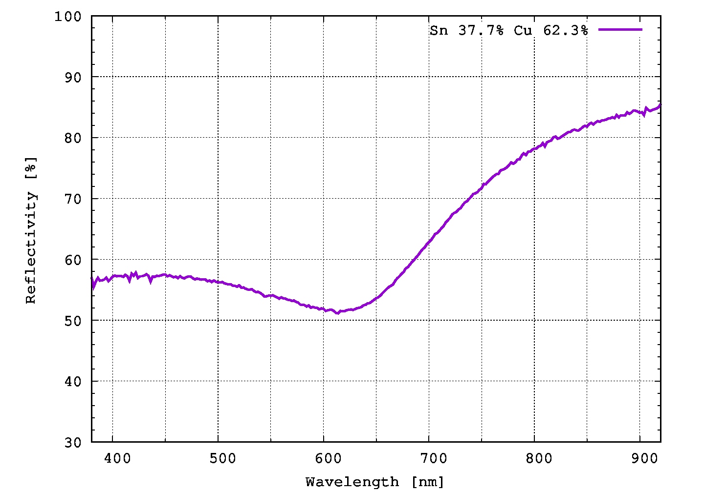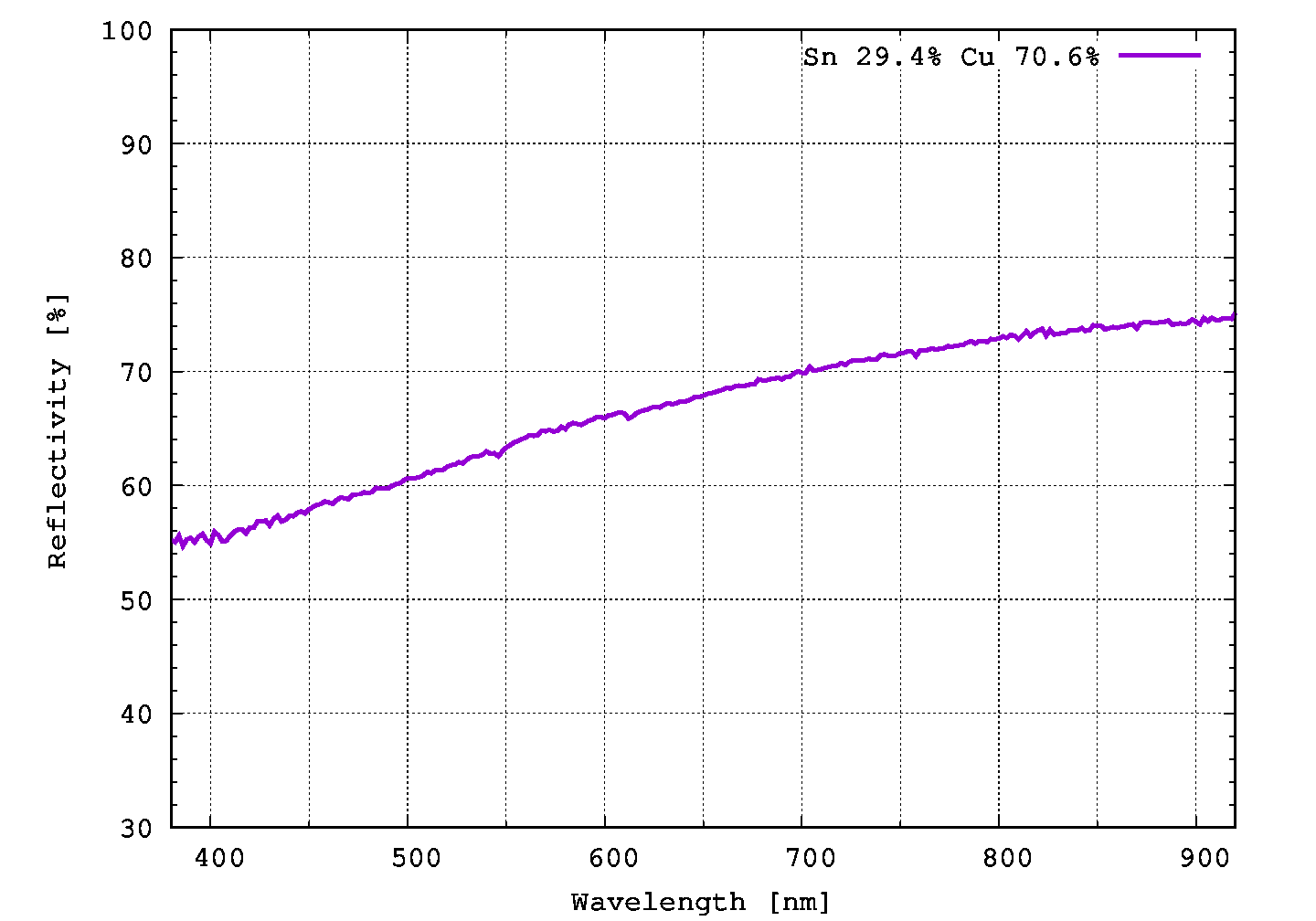 錫 29.4%、銅 70.6% ハーシェルの金属鏡 揚がり湯面で数mmの収縮 硬くて脆いが加工性は良い、うっすらとうろこ状の模様、大きさは1mmぐらい |