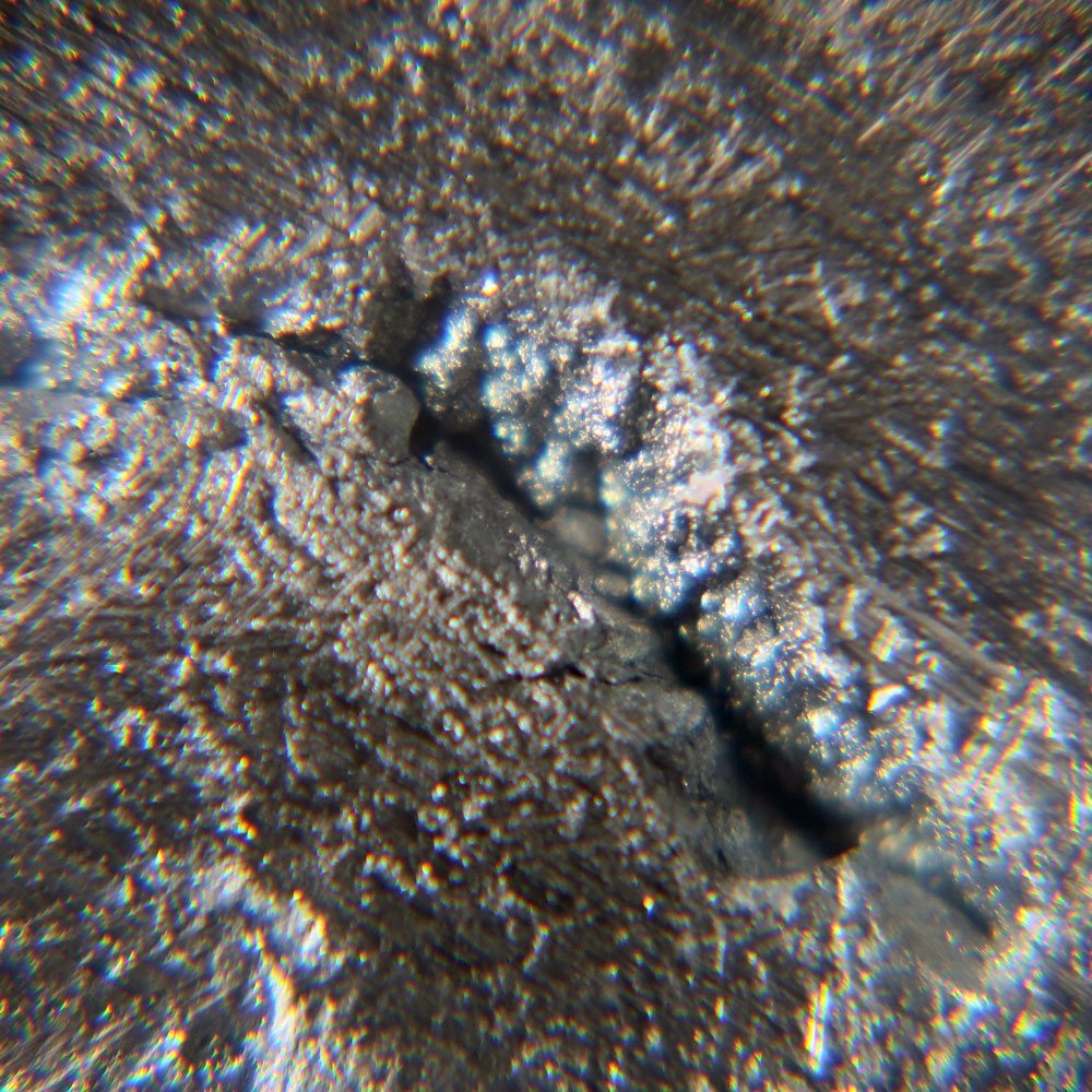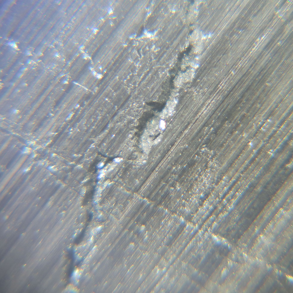 | 錫 33.4%、銅 67.0% 国友一貫斎の金属鏡? Cu41Sn11(δ相?) 揚がり湯面が数mm陥没して穴になる 非常に脆い、サクサク削れる、最もボロボロ、金属と言うよりセラミックのような感じ |