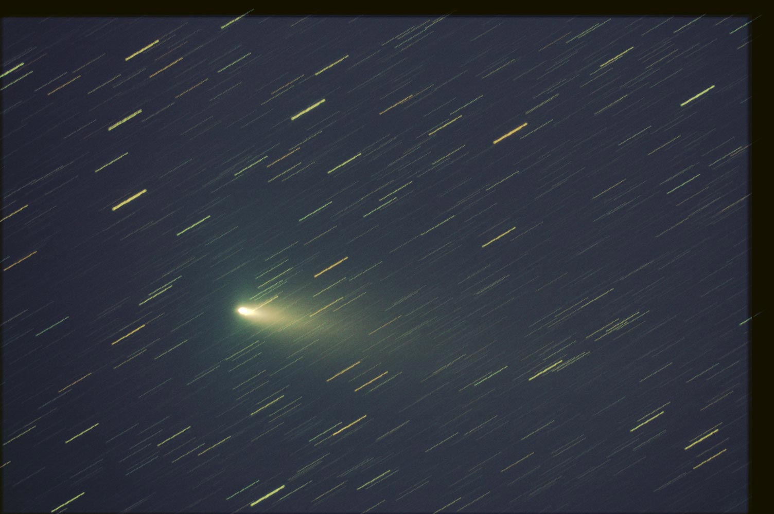 2006年の春に地球に接近した彗星です。肉眼彗星になると言われていた割に、6等台で暗かったです。 この彗星は地球に接近したため、彗星の固有運動が大きく、写真ではただし彗星核を基準としてコンポジットしたため星が流れて写っています。
