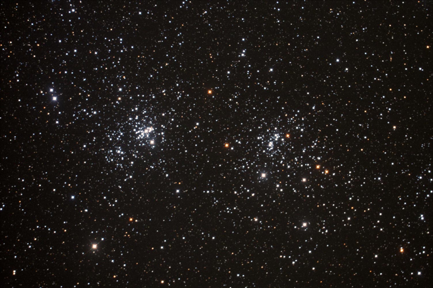 ペルセウス座にある2つの散開星団です。 西の方をh (NGC8699、東の方をχ(NGC884)、2つあわせてh-χ(エイチ・カイ)と呼びます。 写真でもわかるようにχの方にはオレンジ色の星が混じっていることがわかります。
