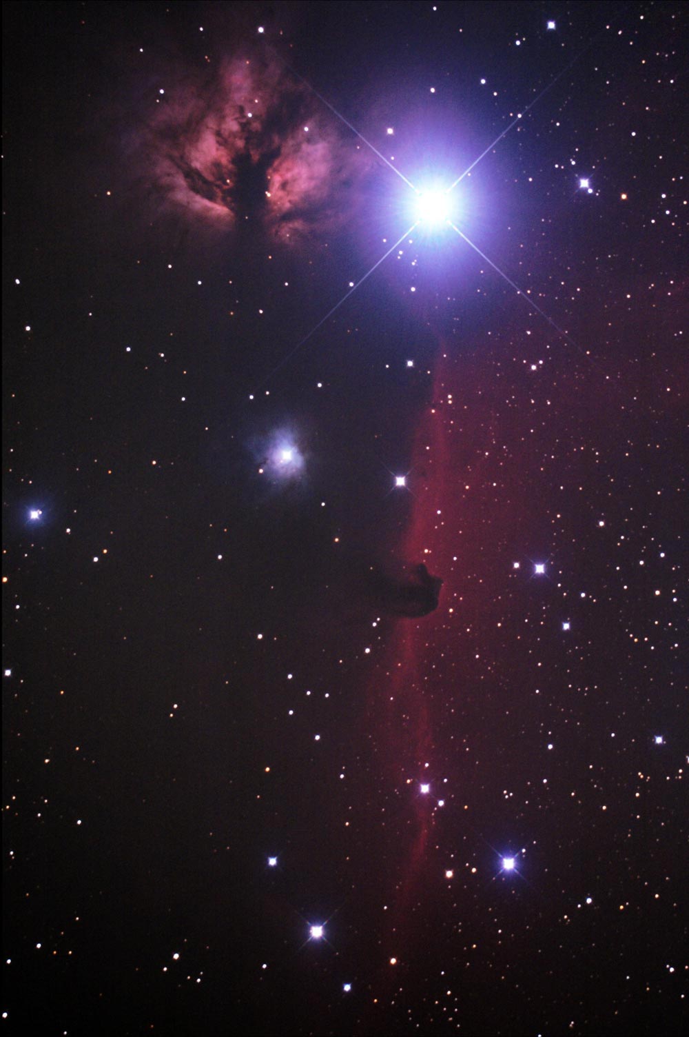 淡く赤く光る星雲の前面にせり出すようにして馬の首のような形が浮かび上がっています。 これを馬頭星雲と呼びます。 馬頭星雲の正体は暗黒星雲と呼ばれる冷たいガスで、光を吸収する為このように黒いくり抜きが生じたように見えるのです。 2011年10月27日に眼視で確認出来ました。スケッチもあわせてご覧下さい。 IC434馬頭星雲のスケッチ
