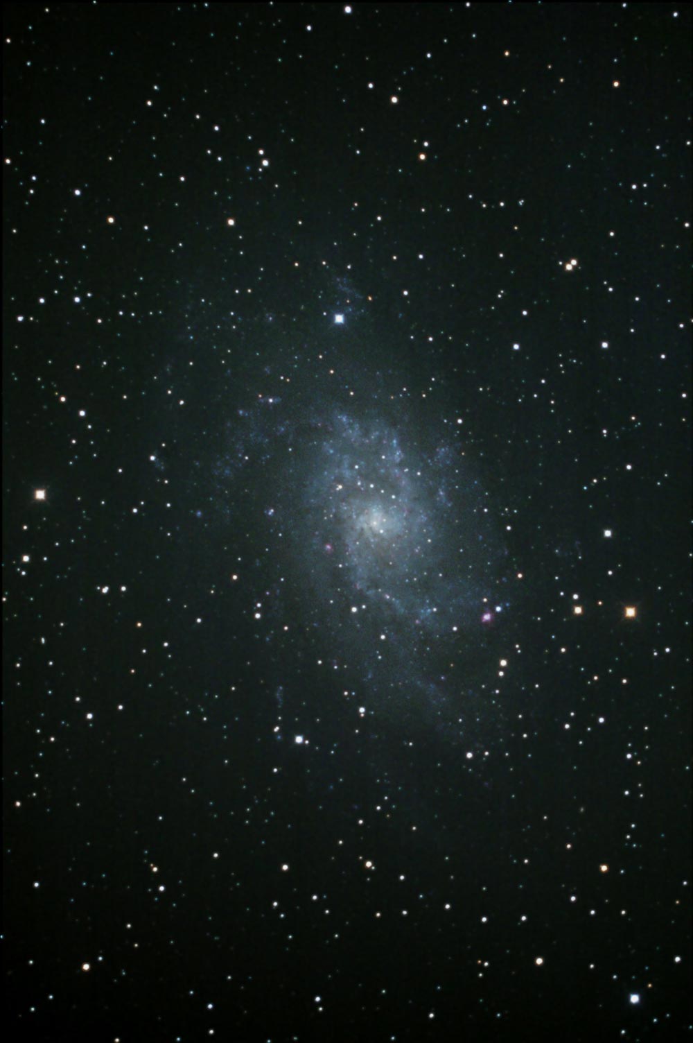さんかく座にある渦巻銀河です。この銀河は現在、星の生成がたいへん活発なことが特徴です。 渦巻に沿って点在するHII領域(赤く見える領域)が星の原料のガスと考えられています。 このことからも星の生成が活発なことがうかがい知れます。 スケッチもあわせてご覧下さい。M33のスケッチ