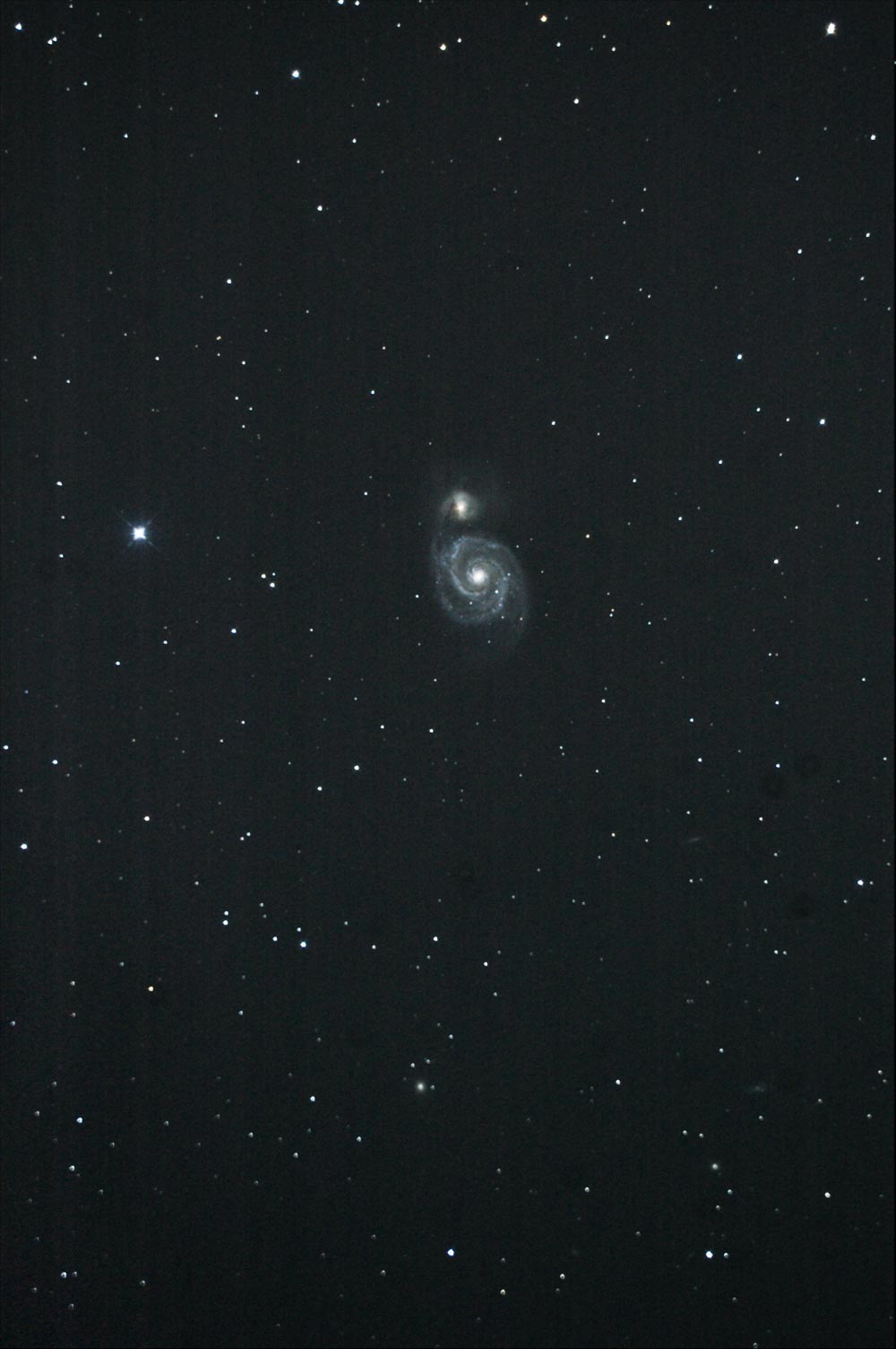大きい渦巻き銀河(M51)と小さい不規則銀河(NGC5195)が、親子が手をつなぐような姿をしているため、 「子持ち銀河」と呼ばれています。これら2つの銀河は実際に重力的に影響を及ぼし合って結びついています。 スケッチもあわせてご覧下さい。M51子持ち銀河のスケッチ