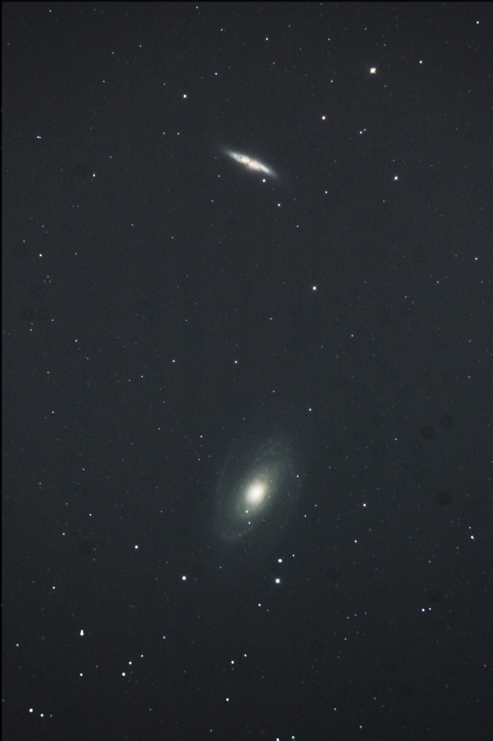 写真下が渦巻き銀河のM81、そして上が不規則銀河のM82です。 M82はおよそ2億年前にM81のすぐそばを通り過ぎたため、M81の重力の影響でM82内のガスがかき回され、 中心部で星が爆発的に誕生していると考えられています。 スケッチもあわせてご覧下さい。M81のスケッチ、M82のスケッチ