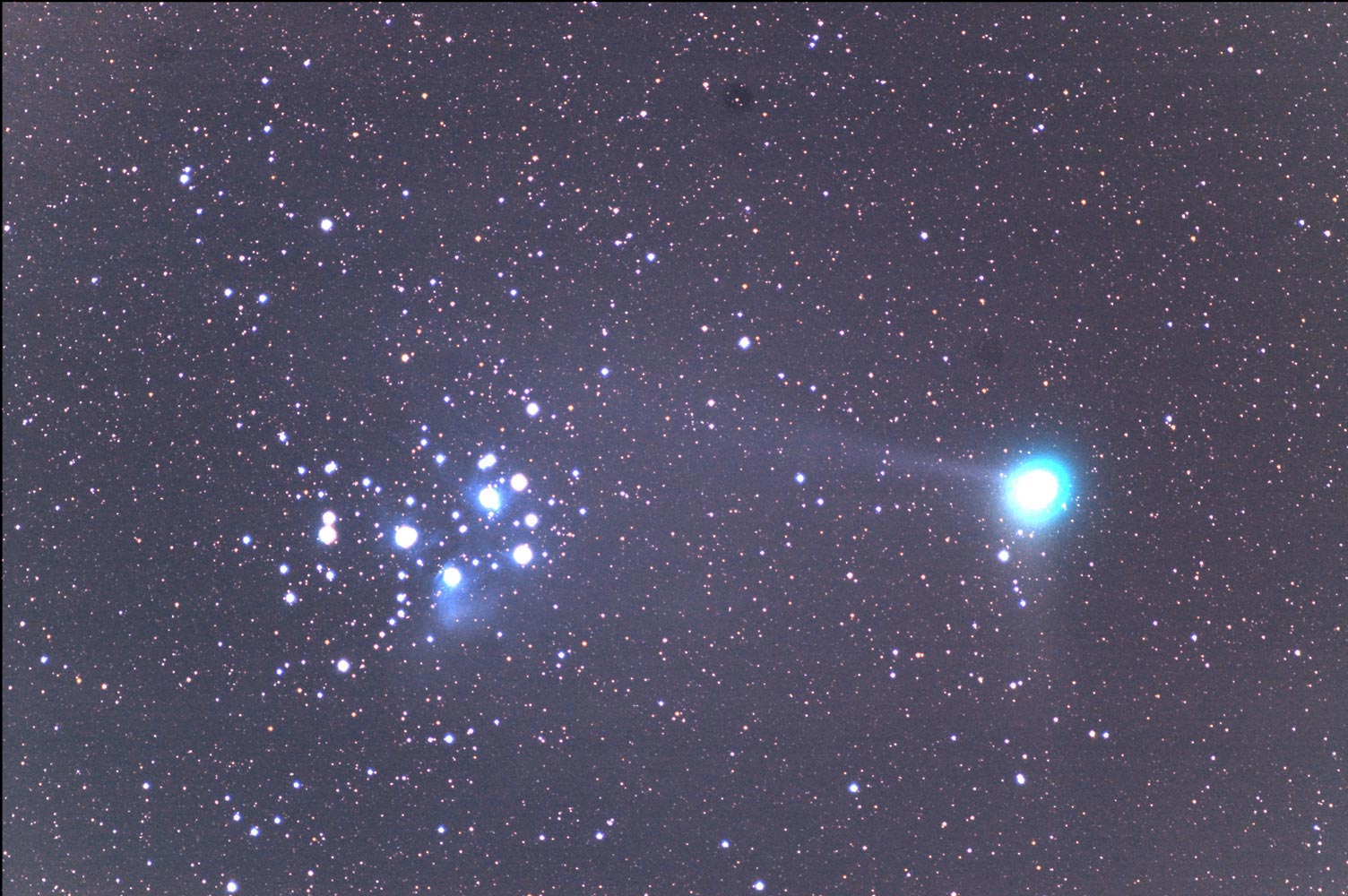 2004年8月にアメリカのマクホルツ氏によって発見された彗星です。 2005年の1月頃地球に最接近し、ひさびさの肉眼彗星となりました。 この写真を撮影した日は偶然「すばる」(写真左の青いガスをまとった星団)に最接近の日でした。