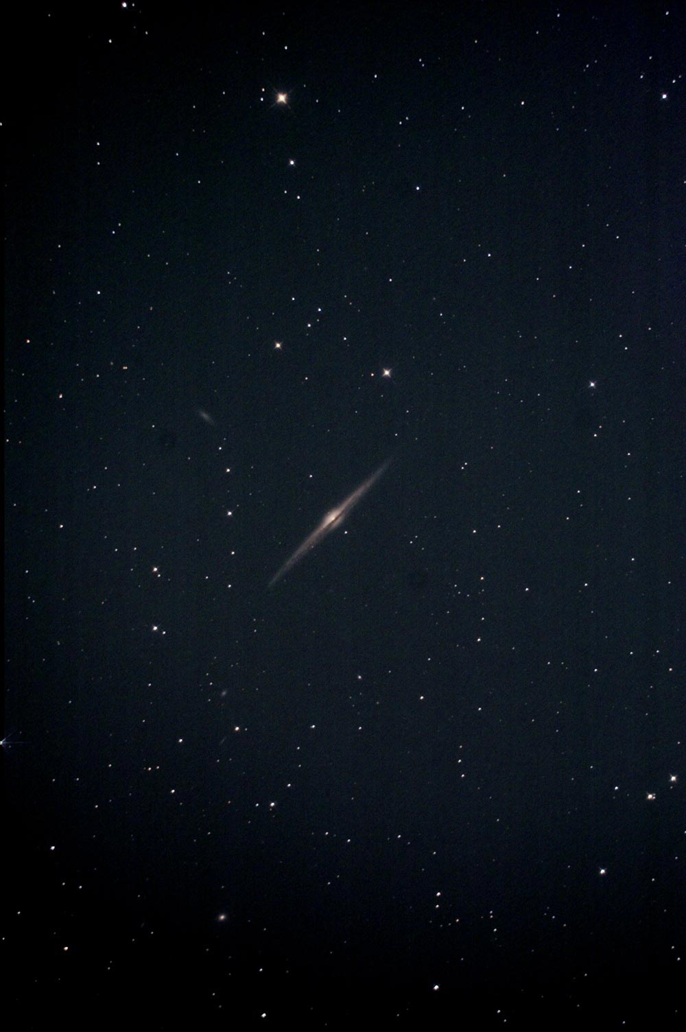 渦巻銀河を真横から見るとこのように見えるという好例です。中央を横切る暗黒帯は冷えた星間ガスです。 このような形の銀河を特にエッジオン銀河と呼びます。